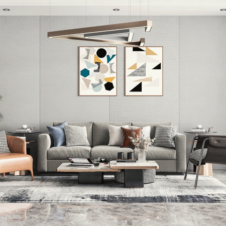 Mẫu phòng khách dành riêng cho người thích không gian sang trọng. Những mảng khối được trang trí bằng những vật liệu hiện đại có tone màu trung tính. Kết hợp các đồ dùng nội thất như sofa, bàn, kệ, đèn trần form Châu Âu sang trọng đến từng milimet.