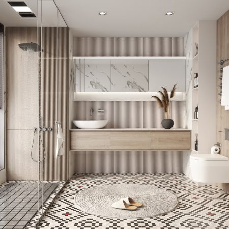 Các đồ dùng, nội thất trong nhà vệ sinh phong cách tối giản phải được sắp xếp để tạo nên một tổng thể thiết kế nhà vệ sinh hợp lý, không quá trống trải mà cũng không quá cầu kỳ.
